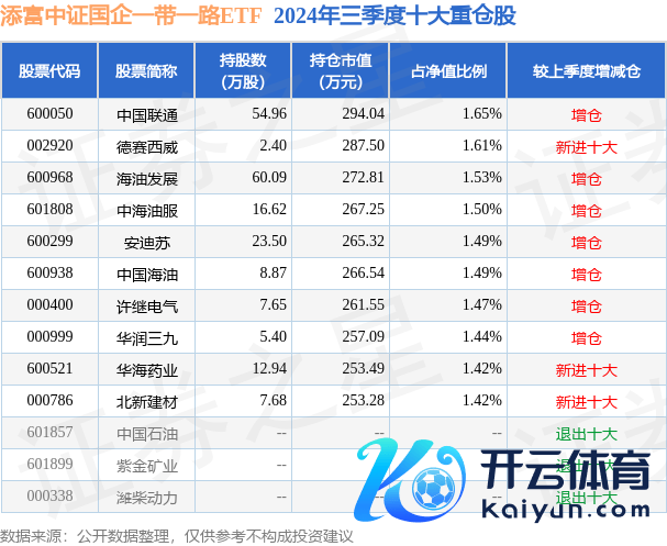 添富中证国企一带沿路ETF为指数型-股票基金,把柄最新一期基金季报透露,该基金金钱成就:股票占净值比98.97%,无债券类金钱,现款占净值比1.12%。基金十大重仓股如下: