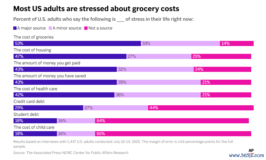 访问透露,其中约一半东说念主称其为“主要压力源”,33%的东说念主暗意这是一个“次要”压力起头。惟有14%的受访者以为这不是压力的起头。这凸显出大大量好意思国东说念主对平素必需品的老本仍然感到宽广的焦急。