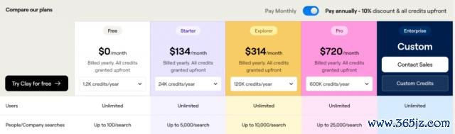 试用期扫尾之后,Clay 会把这个试用期滚动为基于使用量和功能的信用等第,Clay 的产物订价接收按需付费的面容。Clay 允许用户走访跨越 75 流派据提供商,而这些提供商蓝本需要用户自行付费,因此 Clay 的积分系统使用户好像径直走访这些提供商,并将它们组合起来以最大放手地提高数据质地,而且只需通过 Clay 积分支付所需的用度。